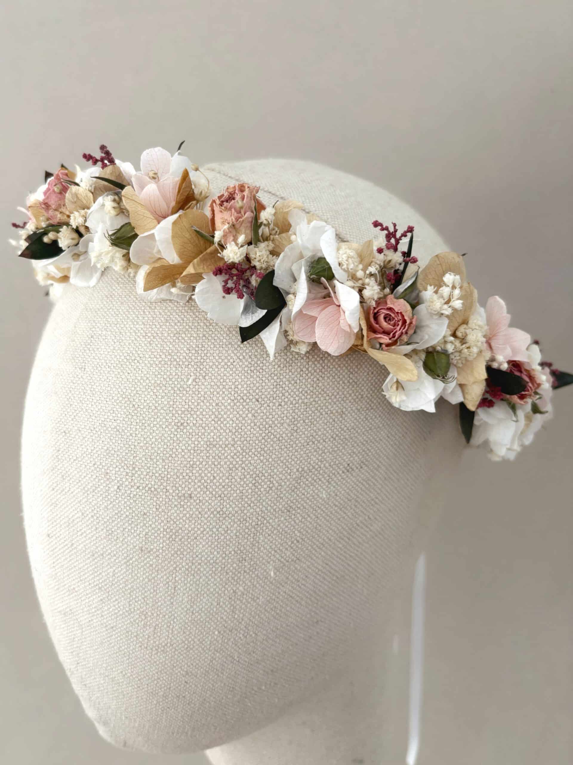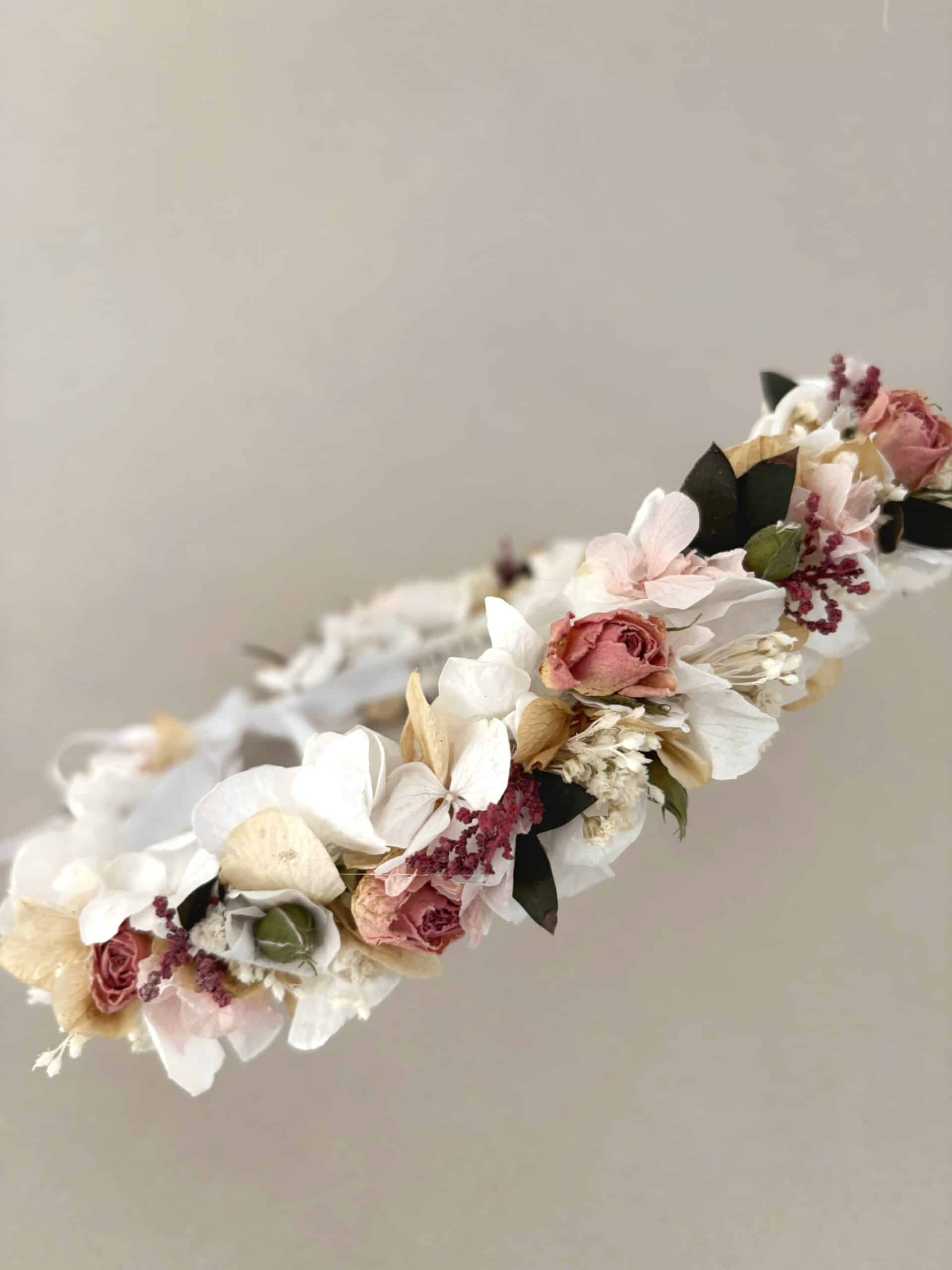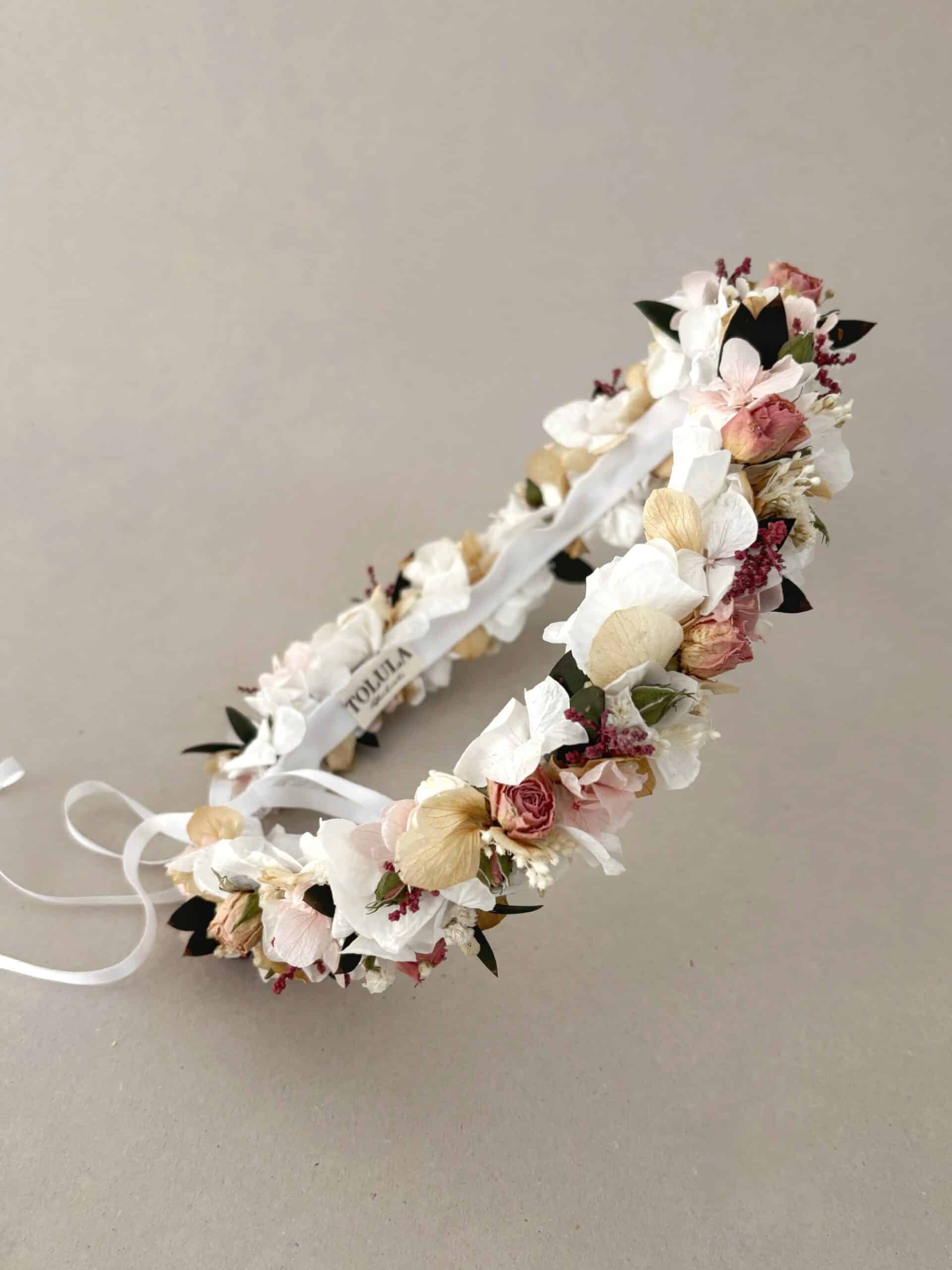La corona de flores preservadas Azucena es ideal tanto para la Primera Comunión como para Dama de Arras. Es una corona sencilla, atemporal y llena de pequeños detalles.