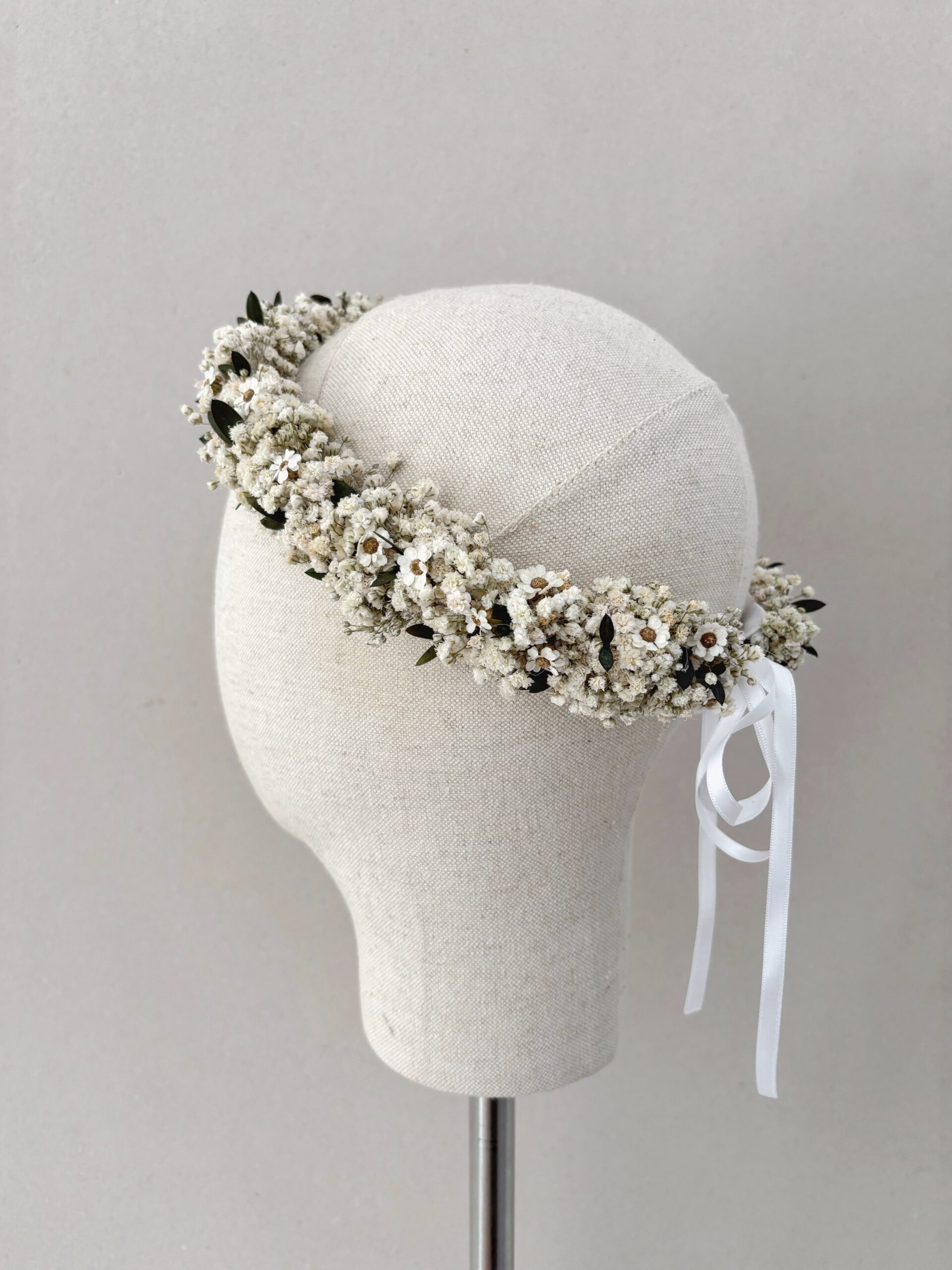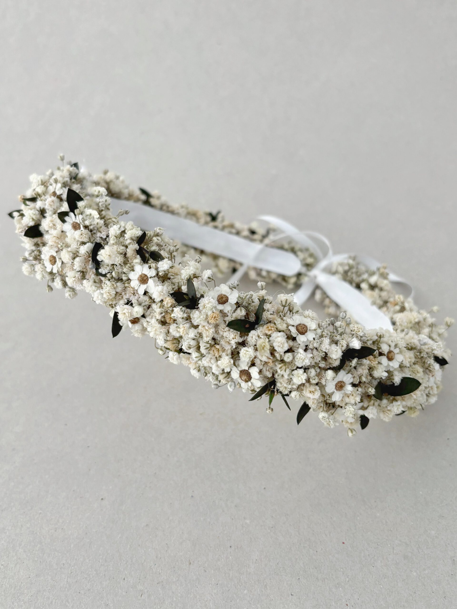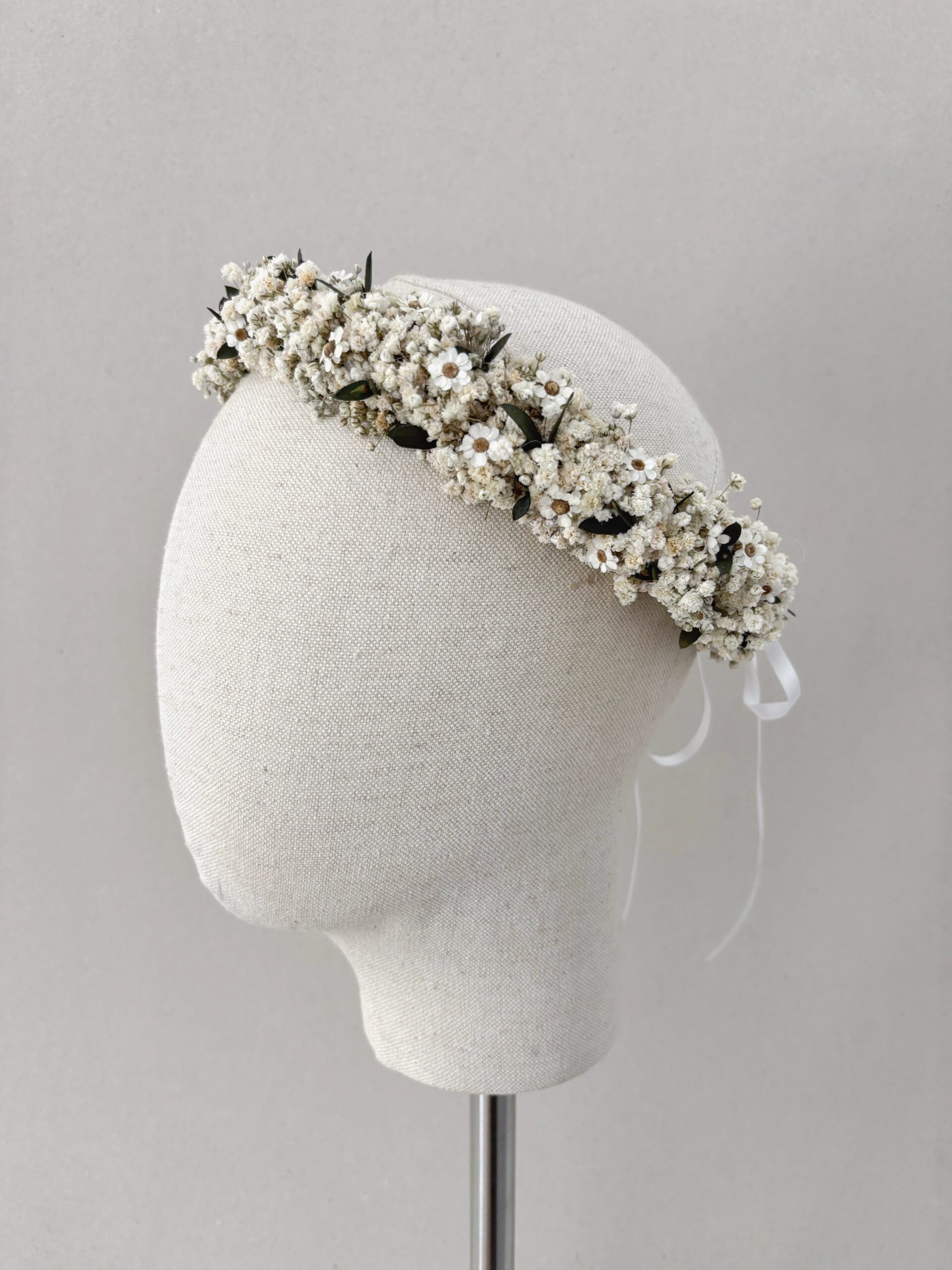 La corona de flores preservadas Azalea es una pieza sencilla y elegante, ideal para novias que buscan un tocado hecho con flores naturales. Está compuesta por paniculata, eucalipto y pequeñas margaritas, trenzadas con mimo para lograr un diseño equilibrado y de aspecto natural.