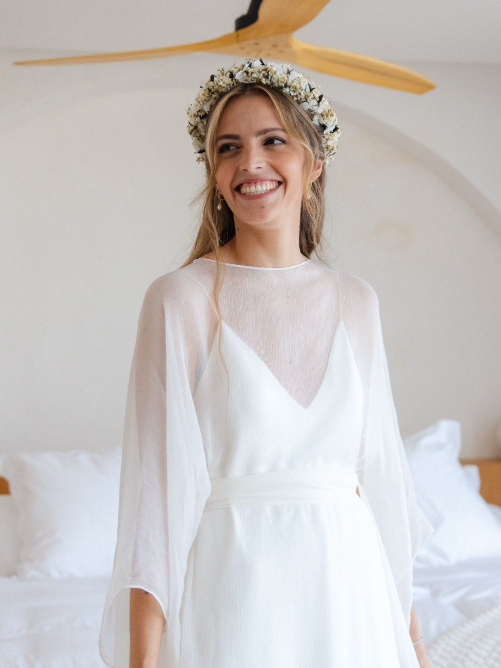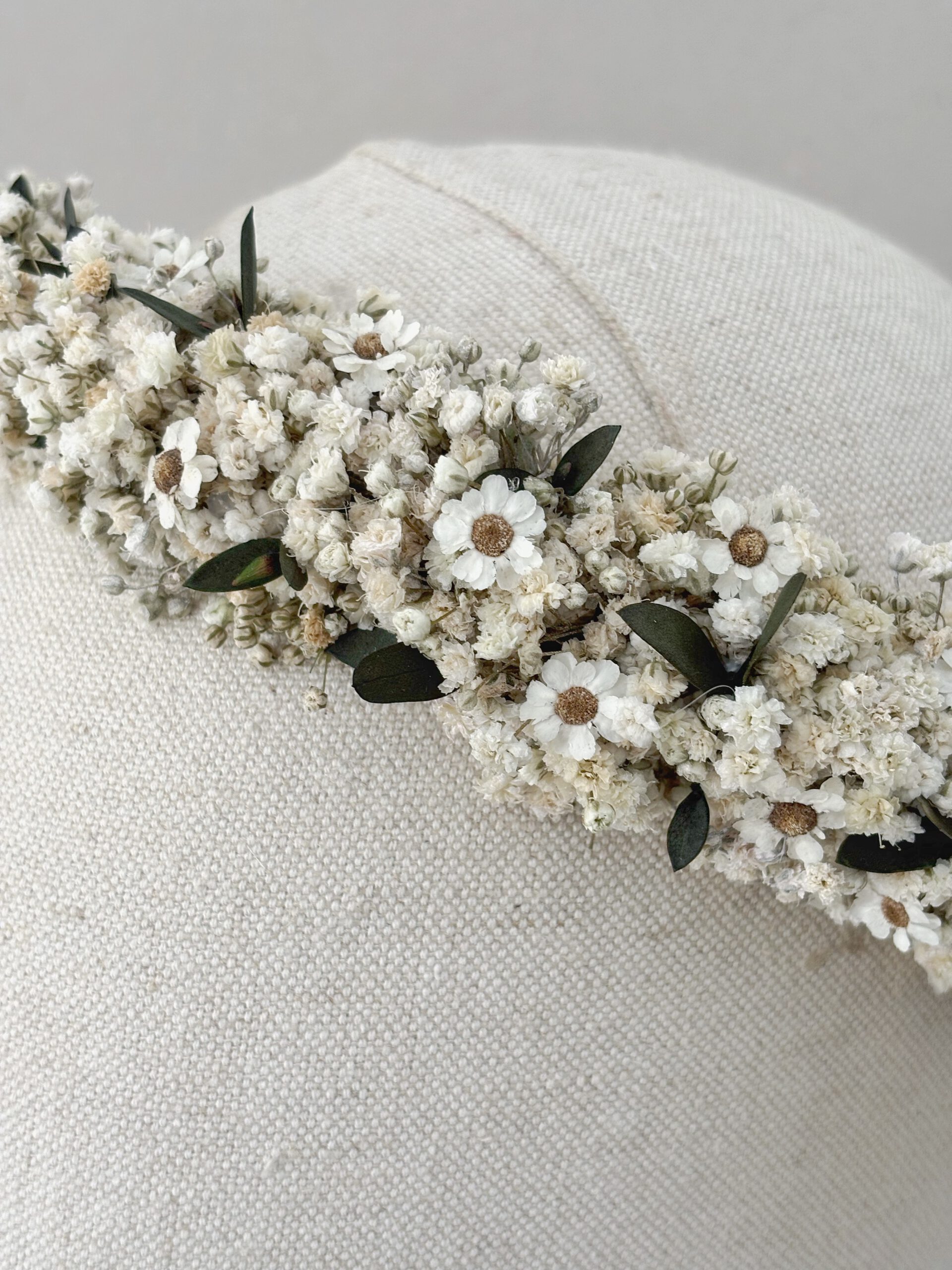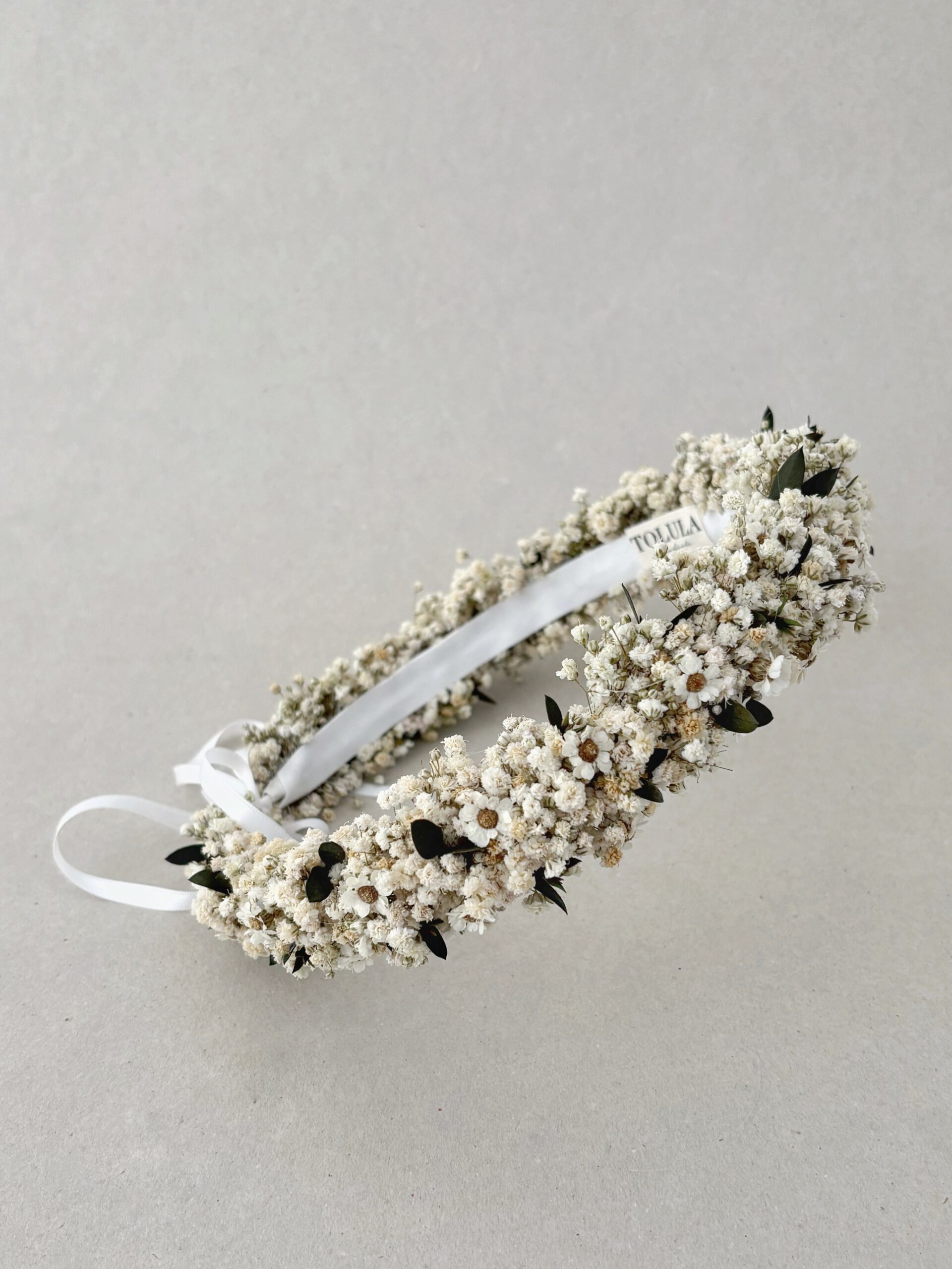 La corona de flores preservadas Azalea es una pieza sencilla y elegante, ideal para novias que buscan un tocado hecho con flores naturales. Está compuesta por paniculata, eucalipto y pequeñas margaritas, trenzadas con mimo para lograr un diseño equilibrado y de aspecto natural.