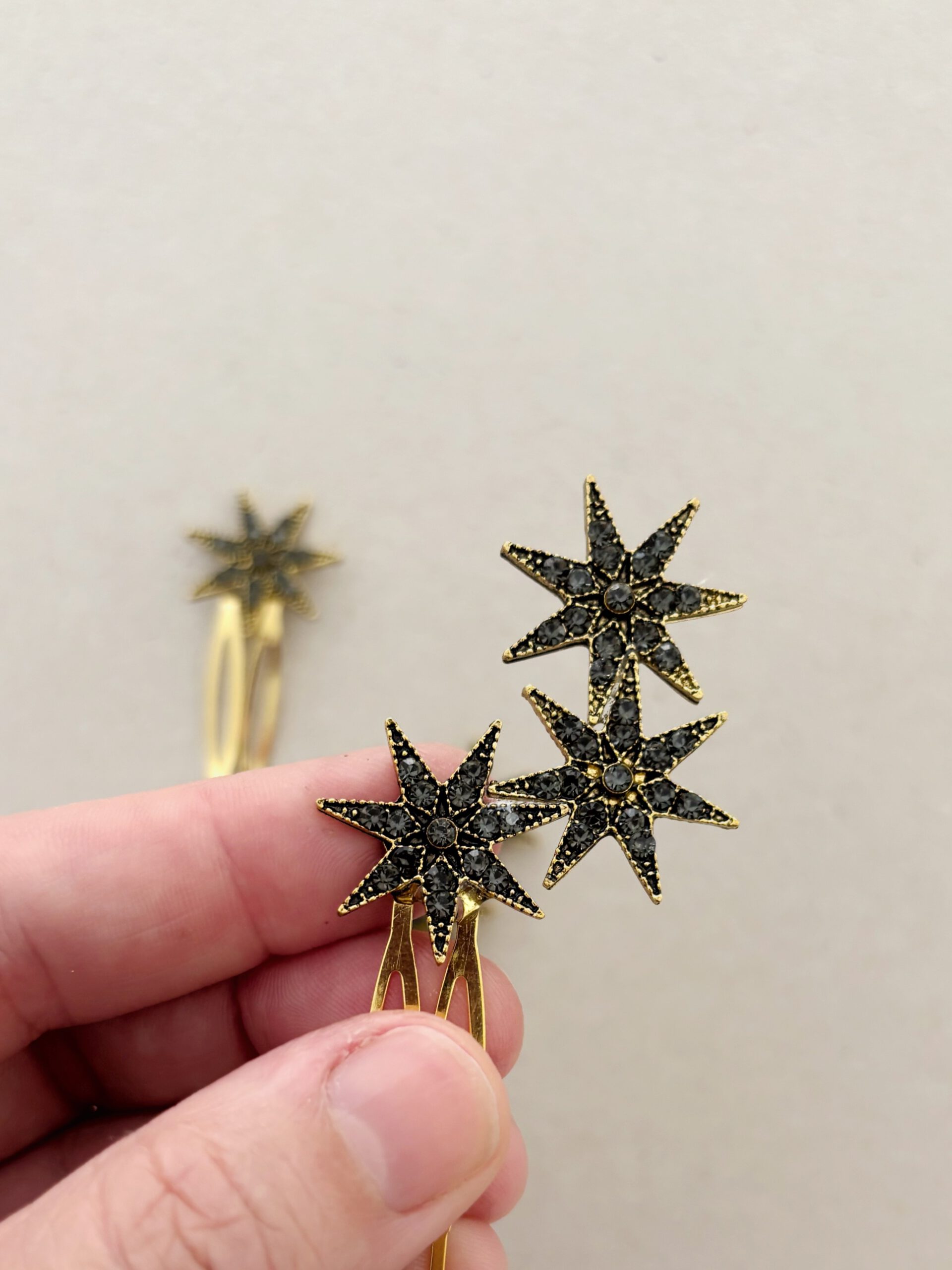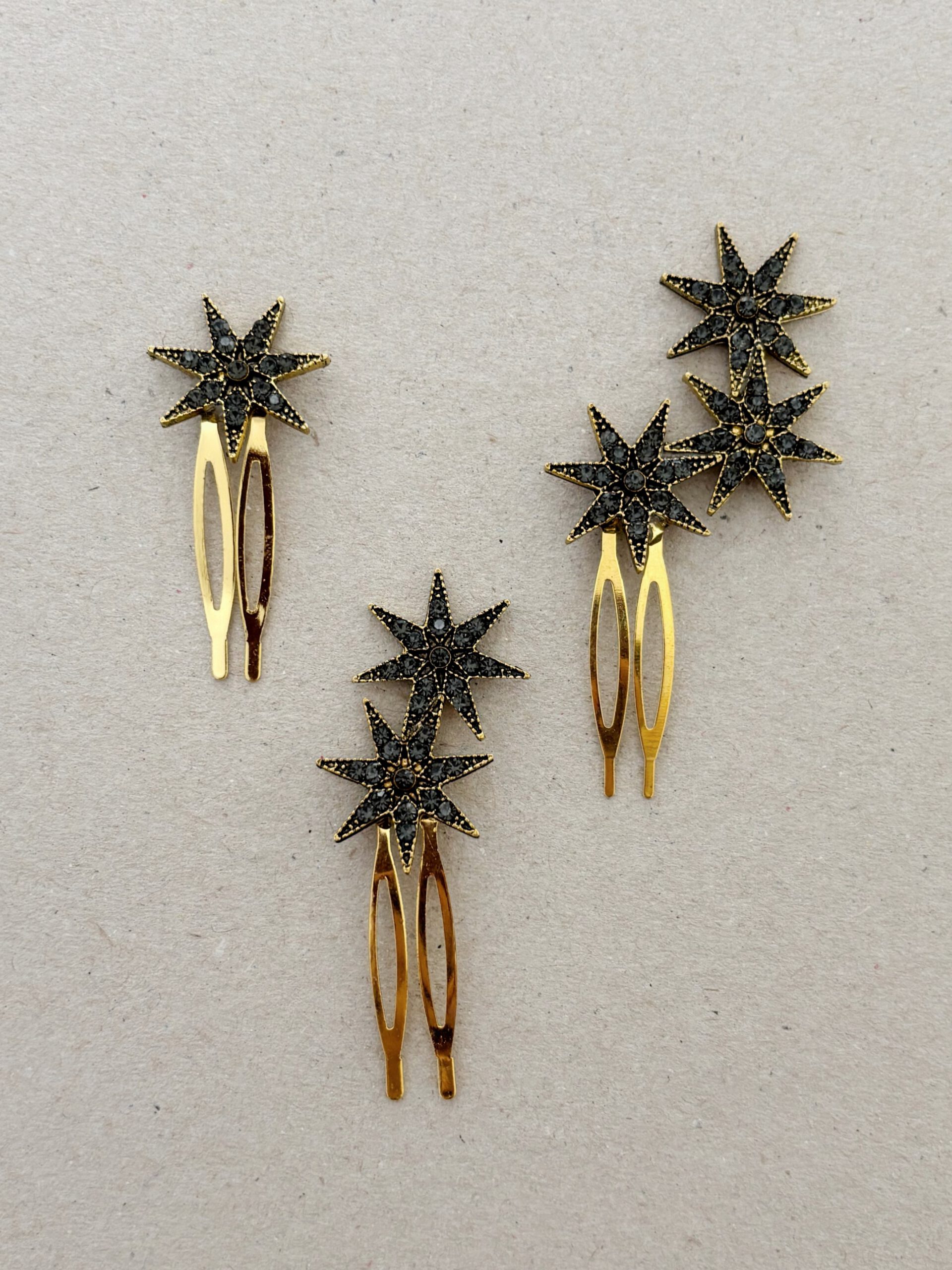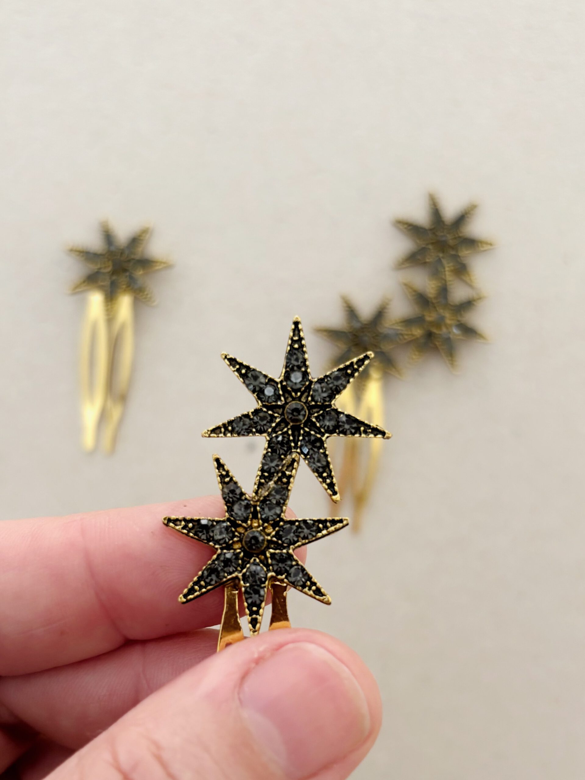 Unas peinetas sencillas, perfectas para colocar en cualquier tipo de peinado. Su diseño compuesto de 3 estrellas doradas y las piedras en tono oscuro que las componen hacen de este complemento el toque original e ideal para cualquier melena.