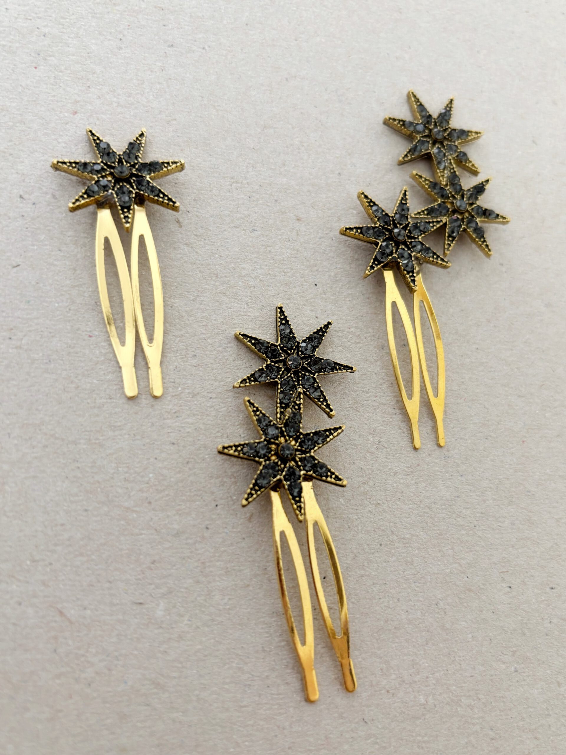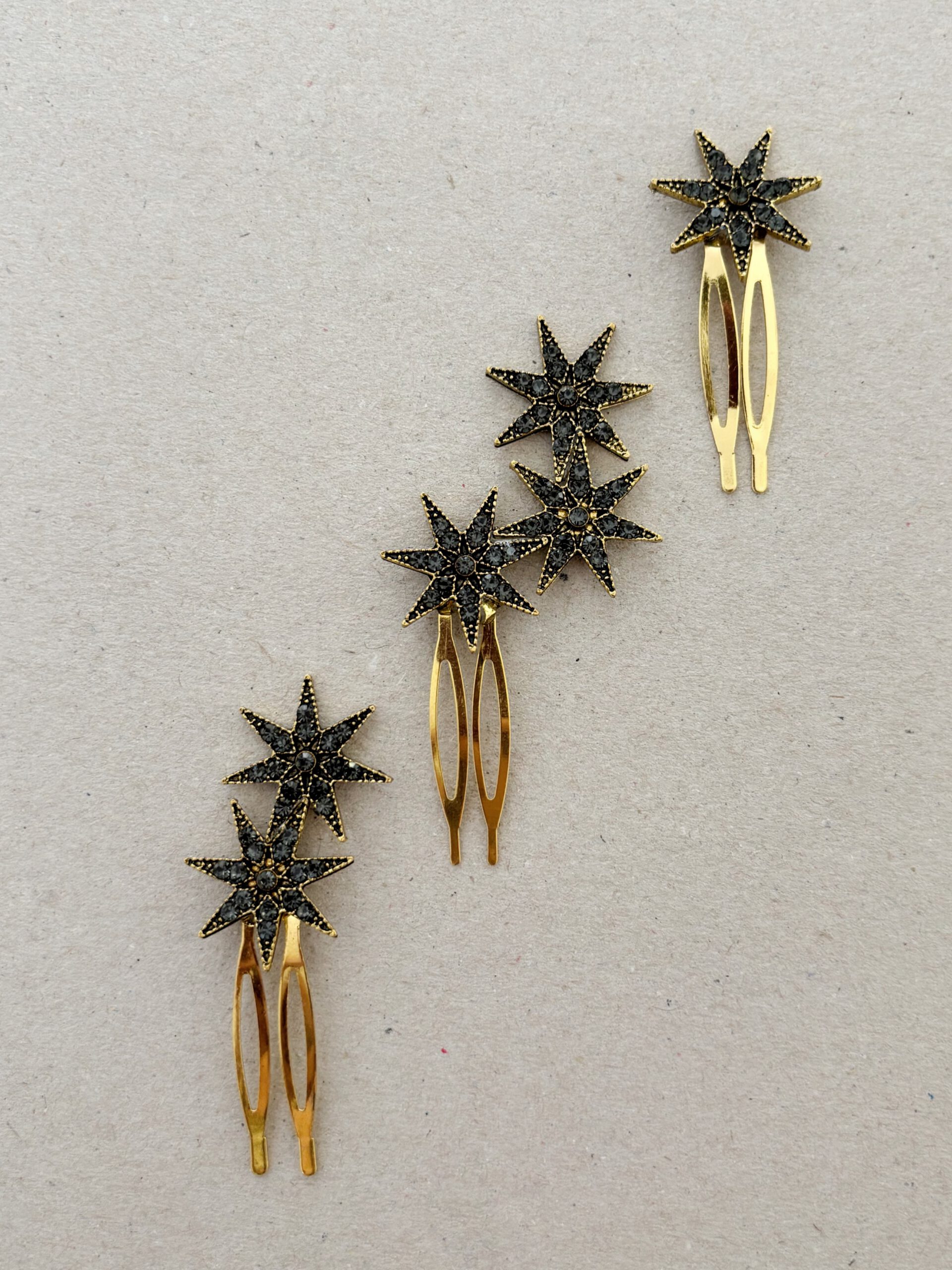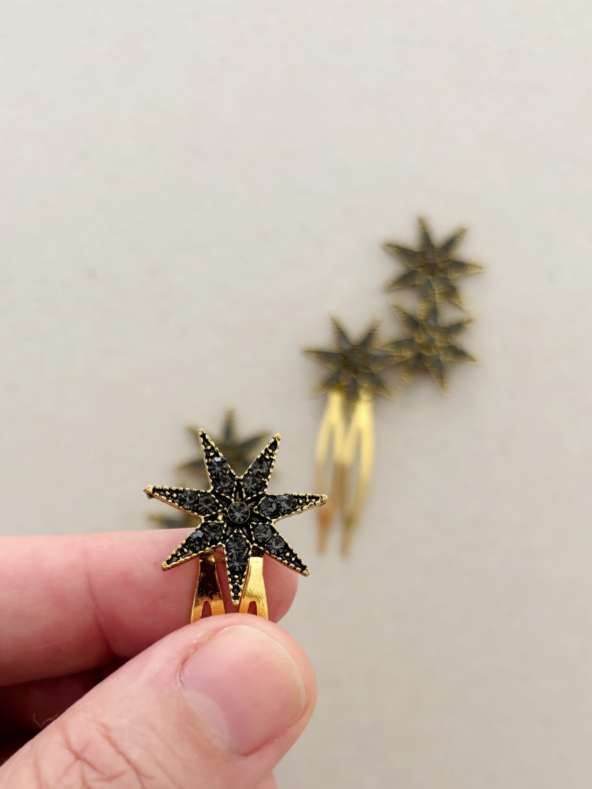 Unas peinetas sencillas, perfectas para colocar en cualquier tipo de peinado. Su diseño compuesto de 3 estrellas doradas y las piedras en tono oscuro que las componen hacen de este complemento el toque original e ideal para cualquier melena.